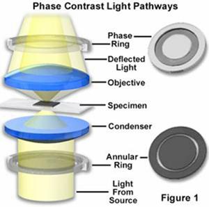 相差显微镜具有两个其他显微镜所不具有的功能:①将直射的光(视野中背景光)与经物体衍射的光分开;②将大约一半的波长从相位中除去,使之不能发生相互作用,从而引起强度的变化。
