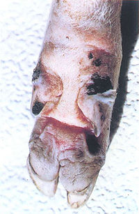 除口腔和蹄部病变外,还可见到食道和瘤胃粘膜有水疱和烂斑;胃肠有出血性炎症;肺呈浆液性浸润;心包内有大量混浊而粘稠的液体。恶性口蹄疫可在心肌切面上见到灰白色或淡黄色条纹与正常心肌相伴而行,如同虎皮状斑纹,俗称“虎斑心”。