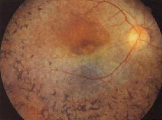 ⑶中心性或旁中心性原发性视网膜色素变性:亦称逆性进行性视网膜色素变性。初起即有视力减退与色觉障碍。眼底检查可见黄斑部萎缩病变,有骨细胞样色素堆积,ERG呈低波或不能记录。早期以锥细胞损害为主,后期才有杆细胞损害。晚期累及周边部视网膜,并出现血管改变。最后以失明告比利时。本型通常为隐性遗传,偶亦有显性遗传。