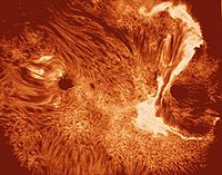 1859年9月1日,两位英国的天文学家分别用高倍望远镜观察太阳。他们同时在一大群形态复杂的黑子群附近,看到了一大片明亮的闪光发射出耀眼的光芒。这片光掠过黑子群,亮度缓慢减弱,直至消失。这就是太阳上最为强烈的活动现象——耀斑。由于这次耀斑特别强大,在白光中也可以见到,所以又叫“白光耀斑”。白光耀斑是极罕见的,它仅仅在太阳活动高峰时才有可能出现。耀斑一般只存在几分钟,个别耀斑能长达几小时。在耀斑出现时要释放大量的能量。一个特大的耀斑释放的总能量高达10^26焦耳,相当于100亿颗百万吨级氢弹爆炸的总能量。耀斑是先在日冕低层开始爆发的,后来下降传到色球。用色球望远镜观测到的是后来的耀斑,或称为次级耀斑。