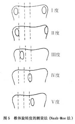 (3)脊柱侧凸旋转度的测定:通常采用Nash-Moe法(图5):根据正位X线片上椎弓根的位置,将其分为5度。