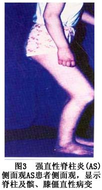 (5)周围关节炎:约1/3以上的病人可有肩关节、髋关节受累,这样就进一步加重了病人的致残后果。关节疼痛往往较轻,而关节运动受限却很明显,例如不能梳头或下蹲困难等。随着病情的发展,可发生软骨变性、关节周围结构纤维化,最后形成关节强直。病程早期,关节运动受限主要是由于关节周围肌肉痉挛所造成。髋关节挛缩,膝关节代偿性屈曲,可使病人,呈前躬腰屈曲姿势,而出现鸭步状态。由于脊柱关节广泛性病变,还可造成扁平胸和严重驼背。