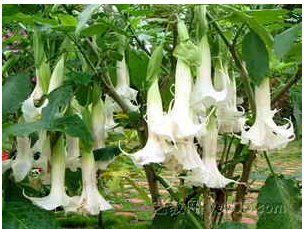 曼陀罗又叫野麻子、青麻棵、洋金花、山茄子、大喇叭花。其根、茎、叶、果实均有毒。含毒主要成分是阿托品、曼陀萝素(又叫茛菪碱)等。食入曼陀萝后主要是阿托品及茛菪碱引起中毒。这些毒素作用表现在对中枢神经的兴奋和对腺体分泌的抑制。误食后0.5~1小时即可完全吸收,三分经10~36小时由小便排出,少量由乳腺中排出。
