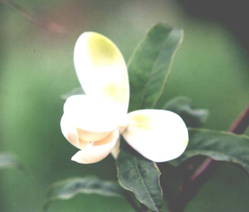 3.落叶乔木,高6-10m。树皮灰白色,近光滑。小枝淡褐色,初时有毛,后变无毛。顶芽卵形,被淡黄色长绢毛。单叶互生;叶柄长1-2.5cm;叶片倒披针形、倒披针状长椭圆形或长椭圆状倒卵形,长6-14cm,宽3-7cm,先端细尖或钝圆,稀短尾状钝尖,基部楔形,全缘,上面深绿色,无毛,下面淡绿色,被极细短毛,羽状侧脉7-10对。花白色,先叶开放,花梗粗长,直立,长 1-1.5 cm,密被淡黄色长绢毛;花被9,外轮3片较小,膜质,萼片状,内两轮白色,基部带红色;雄蕊多数,圆柱状卵形;心皮多数,每心皮有2个胚珠。聚合果圆柱形,长5-8cm,直径1.8-2.5cm,下垂,幼时绿色,稍带紫红色,熟时暗紫黑色,果梗长约1cm,密生黄色长绒毛。花期5-6月,果期8-9月。