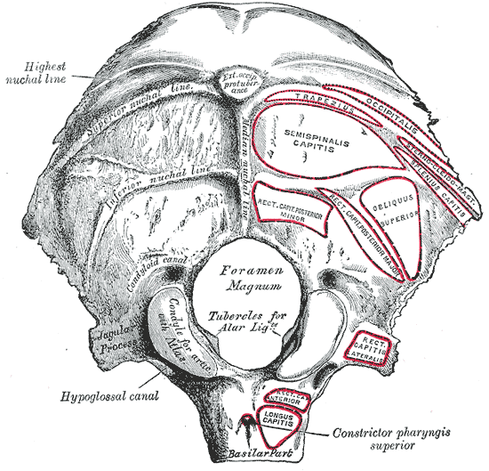 | Occipital bone. Outer surface. (Red circle at upper right is for occipitalis.) | |