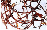 马尾藻植物羊栖菜或海嵩子等的全草。又称落首、海萝、乌菜;其中羊栖菜又称海茜、玉海草、胡须泡。我国辽宁、山东、福建、浙江、广东等沿海地区均有分布。夏、秋季采取,洗净,晒干备用。