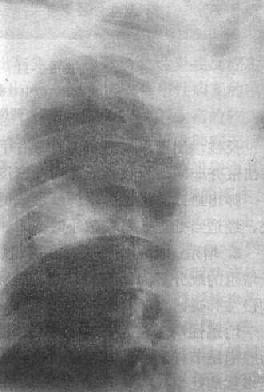 1.渗出与实变 机体的急性炎症反应主要表现是渗出(exudation)。渗出性病变的范围不同,在X线上表现为密度不太高的较为均匀的云絮状影,边缘模糊,与正常肺间无清楚界限(图3-1-10)。肺部急性炎症进展至某一阶段,肺泡内气体即被由血管渗出的液体、蛋白及细胞所代替,形成渗出性实变(consolidation)。渗出是产生实变常见原因之一。实变在大体病理上为肺泡内的空气被病理性液体或组织所代替。这些病理液体可以是炎性渗出液、血液及水肿液。见于肺炎、渗出性结核、肺出血及肺水肿等。由于病理性液体可以通过肺泡孔向邻近肺泡蔓延。因而病变区与正常肺组织间无截然分界,而呈逐渐称行状态。实变可大可小,多数连续的肺泡发生实变,则形成单一的片状致密影,边缘模糊,密度较均匀。多处不连续的实变,隔以含气的肺组织,则形成多数小片状致密影,边界模糊。小范围的实变随病变的进展可成为大片实变。如实变占据整个肺叶,其边界至叶间胸膜,则形成边缘锐利以叶间胸膜为界的全叶性实变(图3-1-11)。实变中心区密度较高,边缘区较淡。以浆液渗出或水肿为主的实变密度较低;以脓性渗出为主的实变密度较高;以纤维素渗出为主的实变密度最高。当实变扩展至肺门附近,则较大的含气支气管与实变的肺组织常形成对比,而在实变的影像中可见到含气支气管分支影,称支气管气像(air bronchogram)。