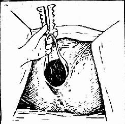 儿头“着冠”后,可取下产钳(图212)。取钳顺序与置入时相反,先下右叶,再下左叶(图213),然后用手助儿头娩出。要注意保护会阴。