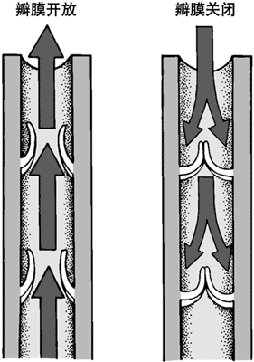 为了保持血液向上而不向下流动,深静脉内有一些单向瓣膜。每个瓣膜由两个相等的部分(瓣尖)组成。血流推动瓣尖使其开放,就像开两扇门一样,由于重力的作用,血流向相反的方向流动时又使瓣尖关闭。