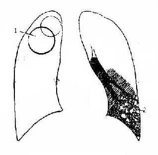 图3-14 空洞的不同形态 1.肺大泡 2.支气管扩张的囊腔