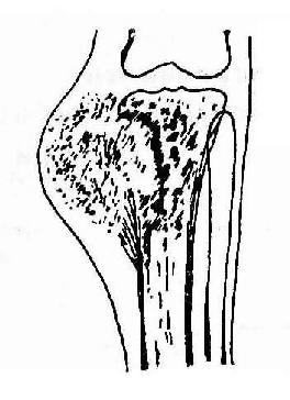是最常见的原发性恶性骨肿瘤,好发于长骨的干骺端,尤以股骨下端及胫骨上端多见。瘤组织主要成分为瘤性成骨组织和类骨组织。根据瘤性成骨组织多少分为硬化型、溶骨型及混合型。