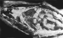 1.湿型 腹膜充血,其上密布无数结核结节(图18-13),一般无腹膜粘连现象,或仅限于少数区域。腹腔内积存大量腹水,多呈草黄色,亦可为血性。病人常有腹胀、腹痛、腹泻及中毒症状。