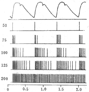 图4-26单根窦神经压力感受器传入纤维在不同动脉压时的放电图