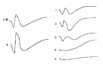 ERG的病理改变,可表现在ERG中各峰值的延迟、ERG成分的缺损、ERG各峰幅度的病理性改变(增大或减少),根据Karpe 的研究,ERG的病理性改变可为六型,如图2--31 所示。