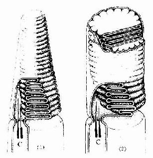 (1)感光细胞(photoreceptor cell):又称视细胞(visual cell),细胞的胞体构成外核层,由胞体向内、外两侧分别伸出内突和外突。视细胞分视杆细胞和视锥细胞两种。前者的外突呈杆状(视杆),后者的外突呈锥状(视锥)(图18-7),故而得名。视杆与视锥垂直伸向色素上皮,构成视杆视锥层。