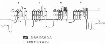 图21-2 钙通道α亚单位的分子结构与二类受体的结合位点